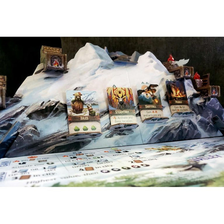 To play a card, you must pay the listed cost of resources. If it is a Critter, you may instead play it for free by using 1 of your 2 Chimneys, so long as you have the necessary Fire to light it. Cards may be played either from your hand, or from the area of face-up cards on the board known as the Valley. Nearly all of the cards in Silverfrost feature new and powerful abilities, offering a huge variety of strategic depth and combos to explore.