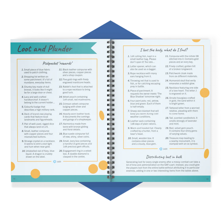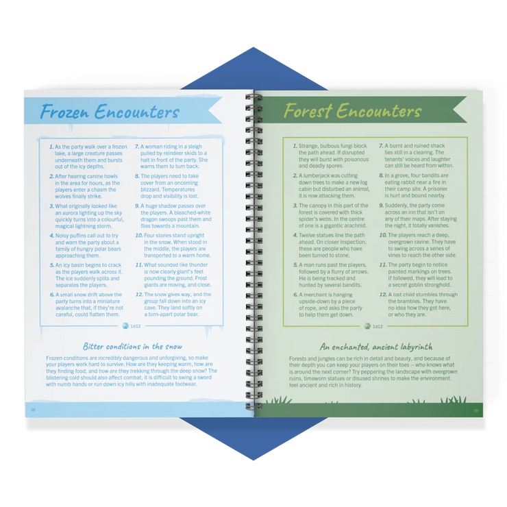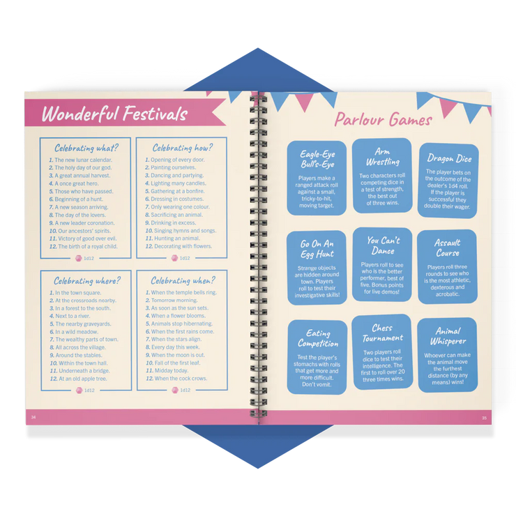 Compatible with D&D, Pathfinder, and all your favourite fantasy RPGs. The compact A5-sized, wire-bound book fits perfectly behind your GM screen, ready to spring into action when inspiration runs dry. Get ready to take your campaign from mundane to mind-blowing with the flip of a page.
