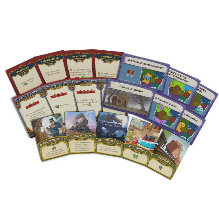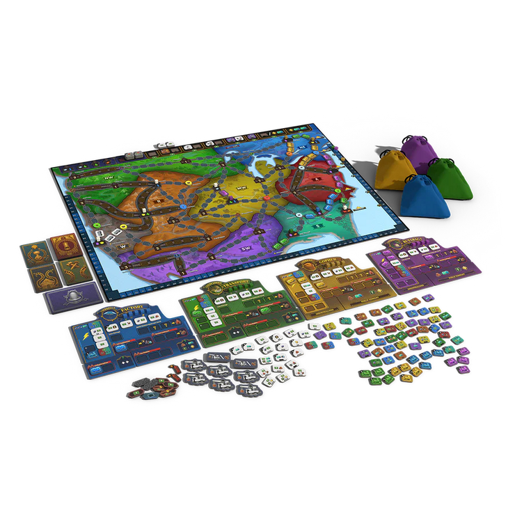 Build your bag to improve your company's resources, then place your chips to open stations and train lines across eight regions of North America. There's a fortune to be made by delivering goods to the cities that need them...but will you work together, or look to cut out the competition? Which stations do you need to secure a route to victory? How can the powerful lightning trains accelerate you past your rivals?