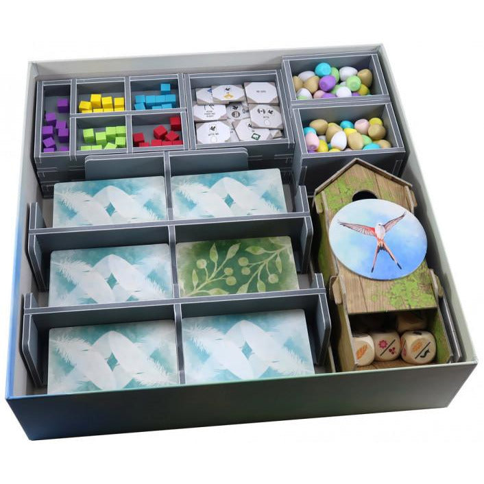 Insert compatible with Wingspan®, and the European® and Oceania® expansions. The design provides both efficient storage and improved game play. Many of the trays can be utilised during the game, and they greatly aid set-up and clear-away times. The rules and boards act as a lid on top of the trays.