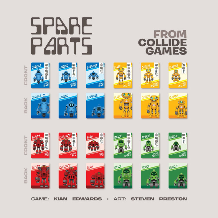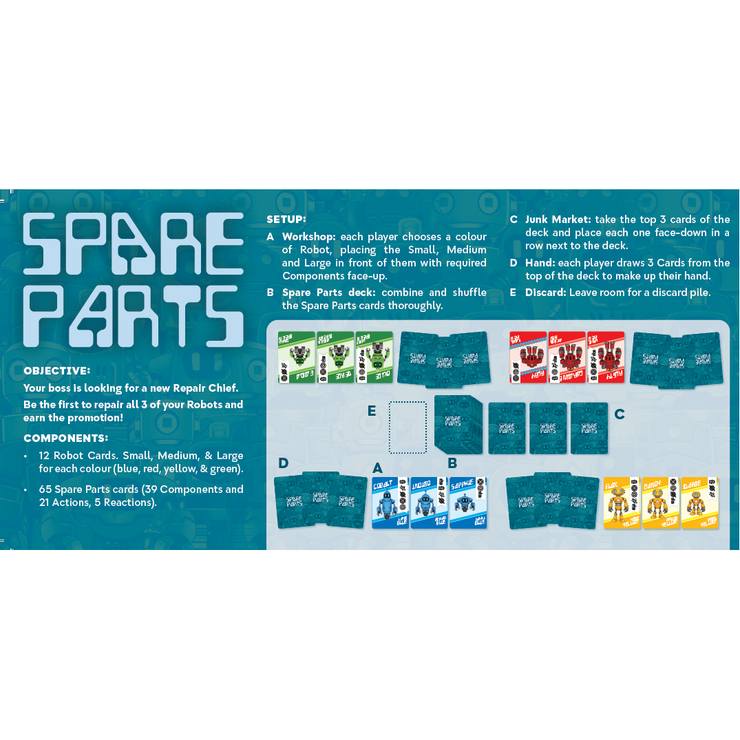 Using unique drafting mechanics with a sci-fi theme, Spare Parts has players competing with one another to see who can finish the repairs of a set of three Robots first. To do this, players will need to sift through piles of junk to collect critical component cards, while stifling the plans of other players with special action and reaction cards.