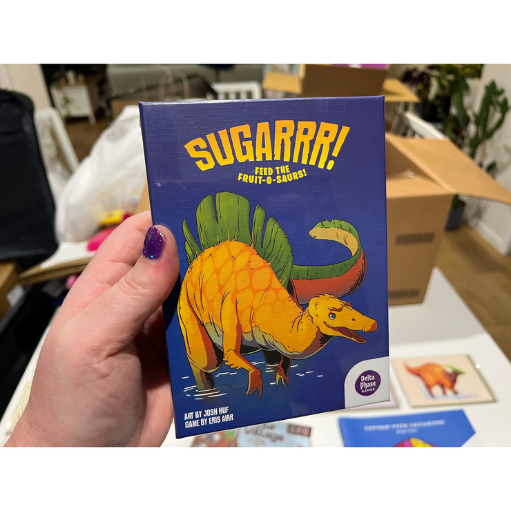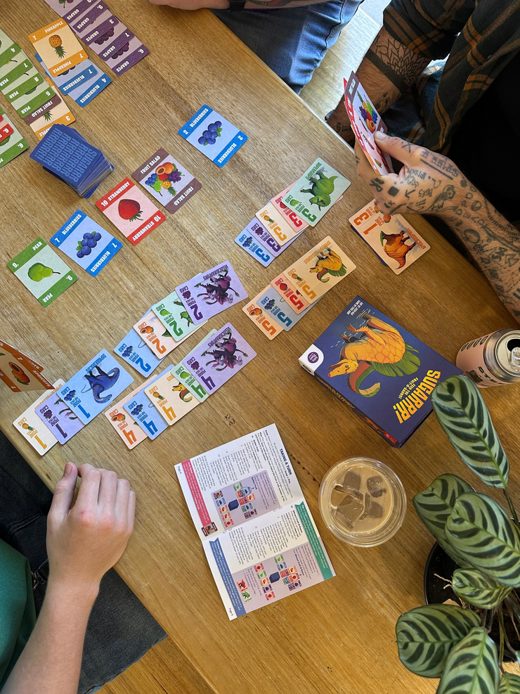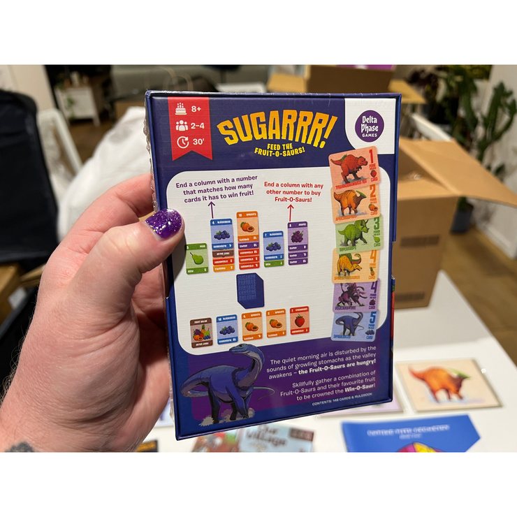 Sugarrr! is a card game for 2-4 players. On your turn you can either swap fruit cards from your hand with fruit cards in a market row, or play fruit cards to one of the five columns in the play area.