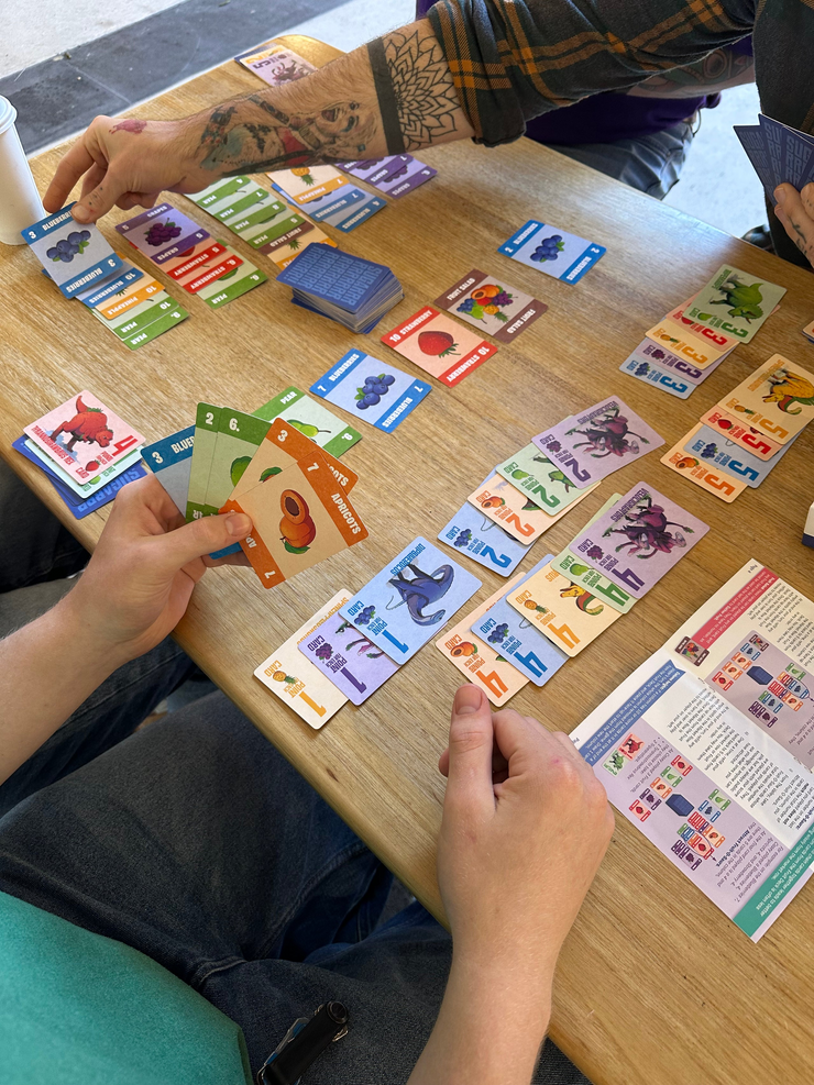 When the game ends, each Fruit-O-Saur will multiply the value of their favourite fruit from your score pile. The player with the most points is crowned the Win-O-Saur!
