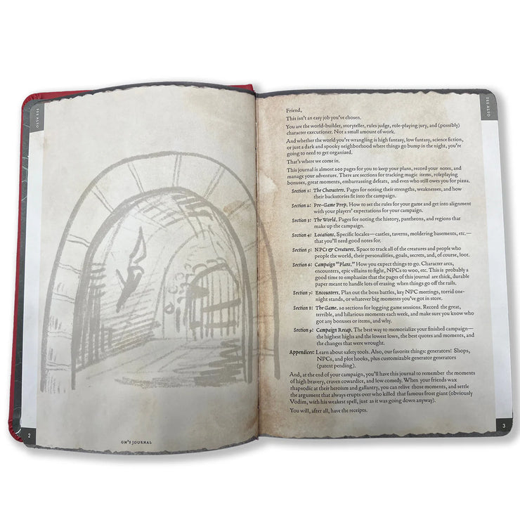 Section 5: Campaign Plan. How you expect things to go. Character arcs, encounters, epic villains to fight, NPCs to woo, etc. This is probably a good time to emphasize that the pages of this journal are thick, durable paper meant to handle lots of erasing when things go off the rails.