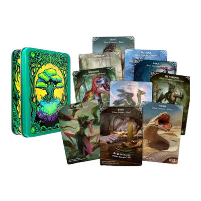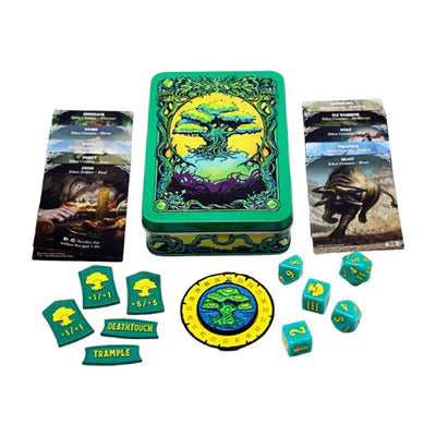 - A gorgeous, embossed tin covered with original green mana art by Justine Jones