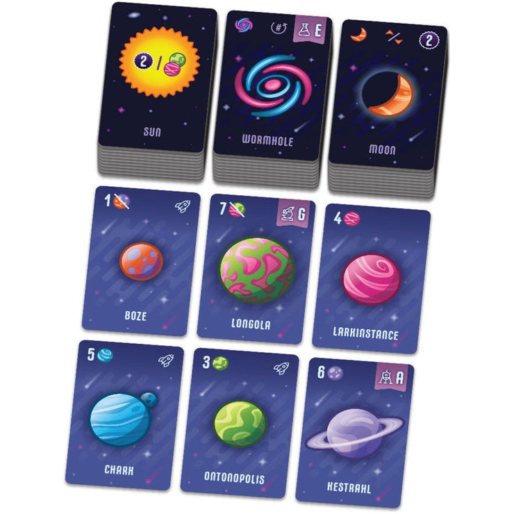 There are over 140 unique double-sided planet/space cards, so you can create a completely different galaxy each and every time you play!