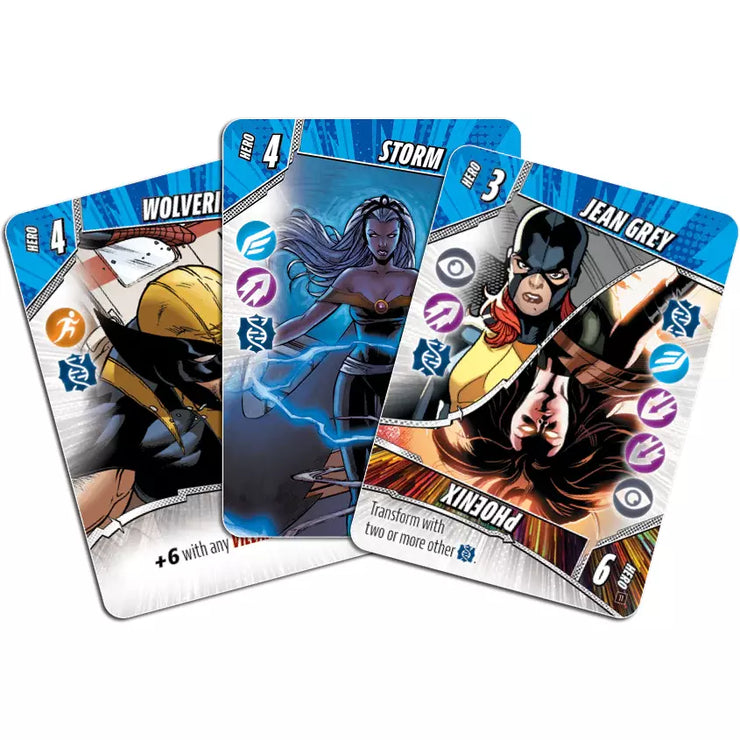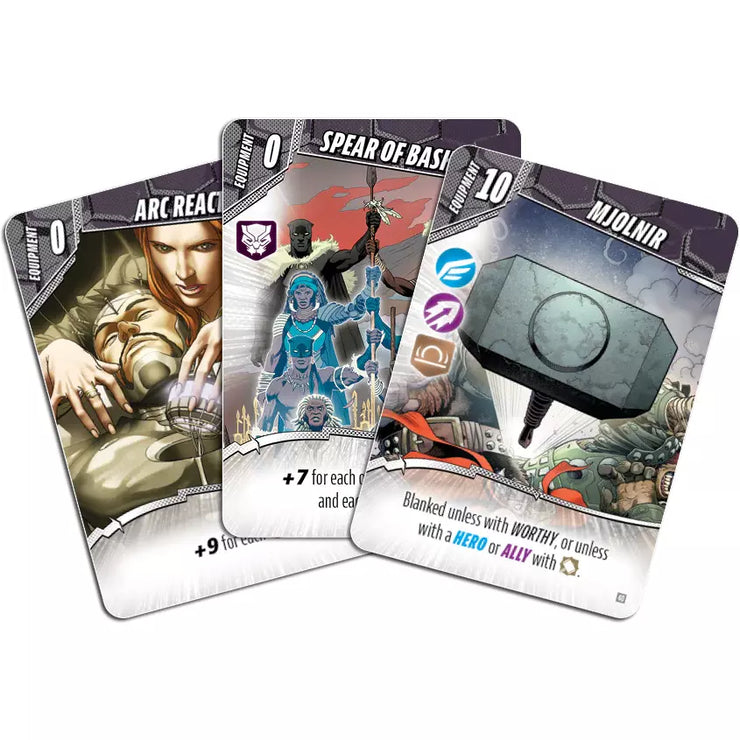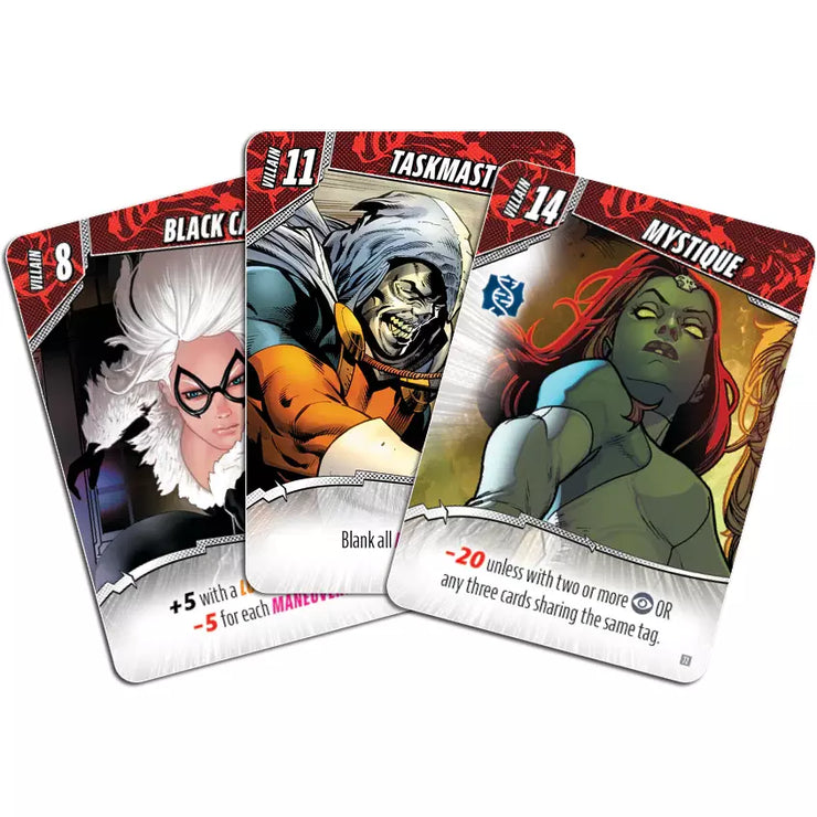 Players are dealt a hand of seven cards representing characters, items, or places from throughout the Marvel Universe. Each turn, you’ll draw from the Hero deck, the Villain deck, or the cards discarded by your opponents, before discarding a card yourself. Cards have a base value, and a bonus that changes based on the other cards in your hand. Whoever has the hand worth the most points at the end of the game is the winner!