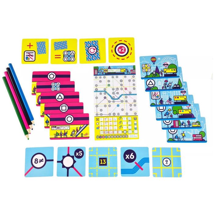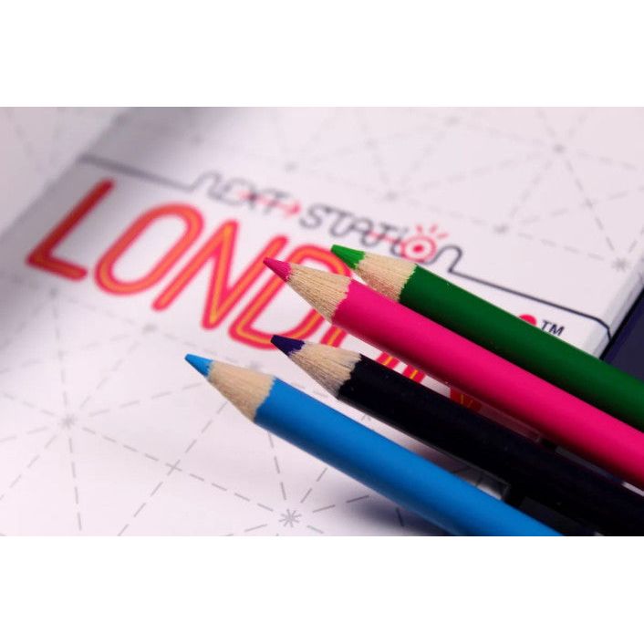 You have been hired by the City of London to redesign their underground lines. Each turn, reveal a new station and create a railway section to expand your subway line. Optimize the number of districts you connect, the tourist sites you access, and take advantage of the tunnels passing under the Thames River to score the most points. Sketch 4 underground subway lines and become the best railway architect in this fun flip-and-write game!