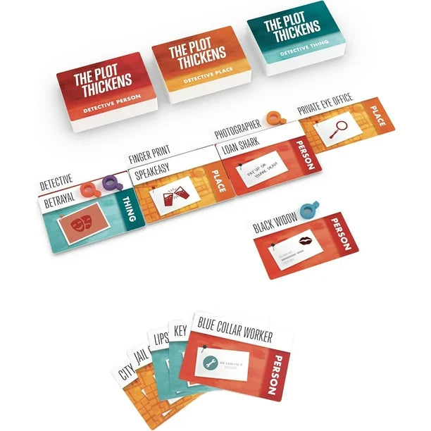 The Plot Thickens is a storytelling game for quick-thinking, imaginative folks just like you and your friends. The object is to take your hand of story cards, (people, places and things) and lay out the tale of your character, and their fate! You’ll earn plot points for every card you use to build your story, and every time you interweave with other’s narratives.