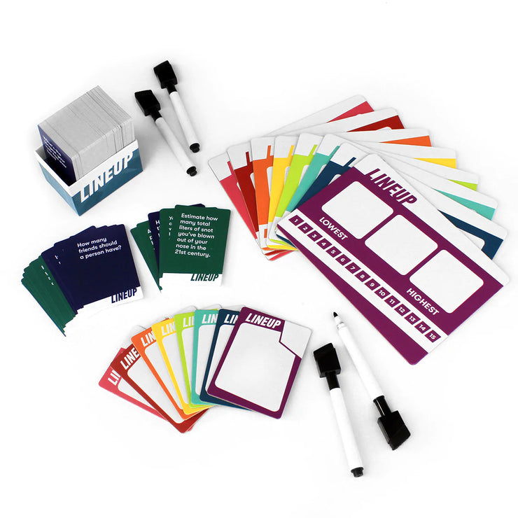 Featuring a variety of questions covering topics from all facets of life, Lineup is a light-hearted party game that will inspire conversations and laughter. If you're a fan of Cut, you’ll love Lineup! The game has some mildly spicy content, but we consider the content family-friendly for teens and up. (Nothing more inappropriate than, say, a Simpsons episode.)