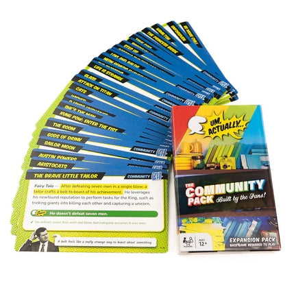 This Community Deck expansion for the game "Um, Actually..." includes 60 questions, proposed and/or chosen by the Kickstarter backers through a variety of online polls and challenges. These additional statements are integrated as a single new topic into the base game.