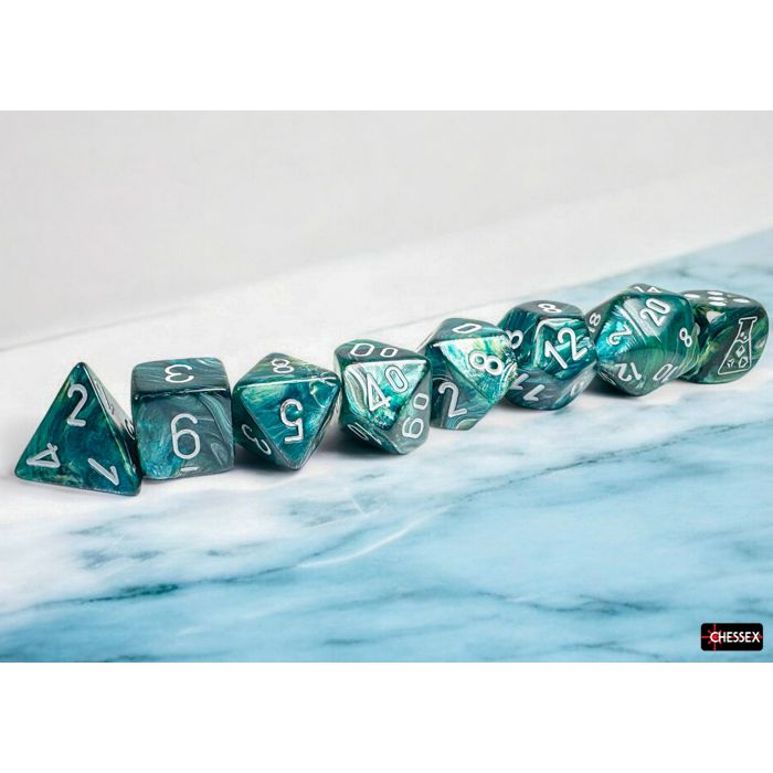 This set contains 8 Lustrous® Neptune™ dice with grey numbers with the following shapes: