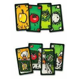 The 128 cards – 120 vegetable cards in the four types and eight "taboo" vegetable cards, two of each type that bear cockroaches – are shuffled and divided among the players. On a turn, a player plays the top card from his deck onto the central pile of cards, naming the vegetable as he plays it, e.g., "Pepper!" – except in the following situations: