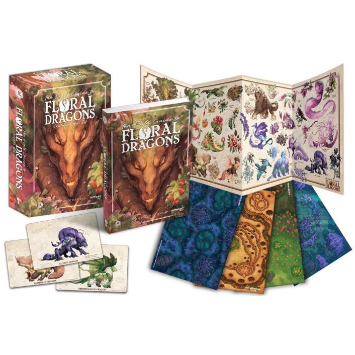 Get the Field Guide to Floral Dragons hardcover book, foldout battle maps, GM screen, and player reference cards all in a beautiful slipcase.