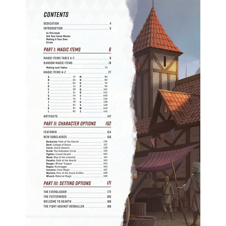 This 208-page book also includes 12 new character subclasses, 3 new settings, a setting-agnostic villain, and a uniquely customizable playable race. If you're tired of using the same old flaming swords or worry about balancing your own magical items, this may be the book you're looking for.