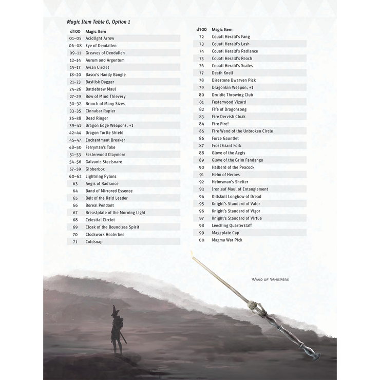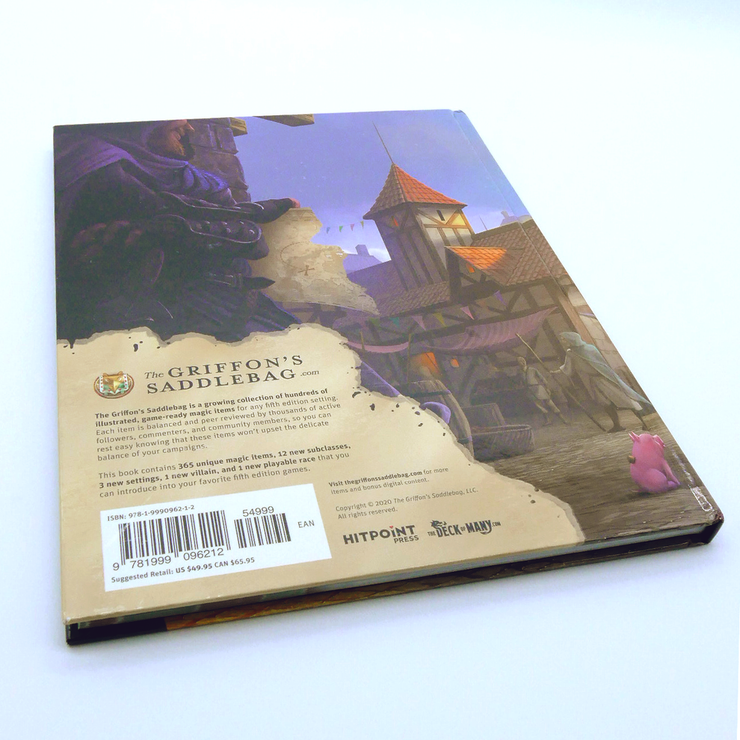 This lushly printed hardcover book is filled with 365 magic items that have been designed, illustrated, and balanced for Fifth Edition by The Griffon's Saddlebag. Fill your campaign with exciting new magical items, such as the dragon tamer's lance or catnip amulet, and reward your players with treasure as unique as their characters. Each item has also been carefully organized into easily searchable charts and random treasure tables. These magical items have been peer-reviewed by thousands of players around the world and strike a charming balance of mechanical intrigue, memorable flavor, and exciting role-playing opportunities.