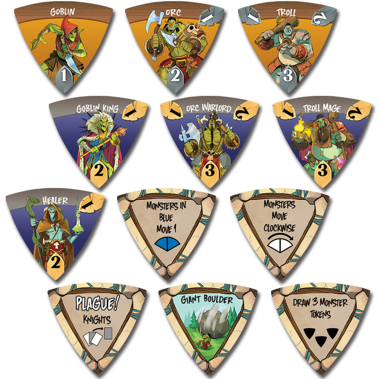 You and your friends must work together to defend your Castle, in the center of the board, from Monsters that attack out of the forest, at the edges of the board. Trade cards, hit and slay Monsters, and plan strategies together to keep your Castle towers intact. You either win or lose together, but only the player with the most victory points is declared the Master Slayer.
