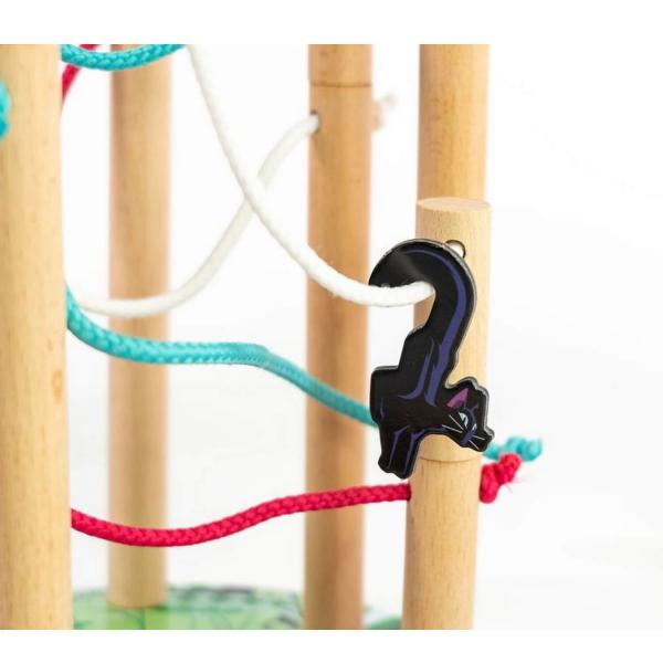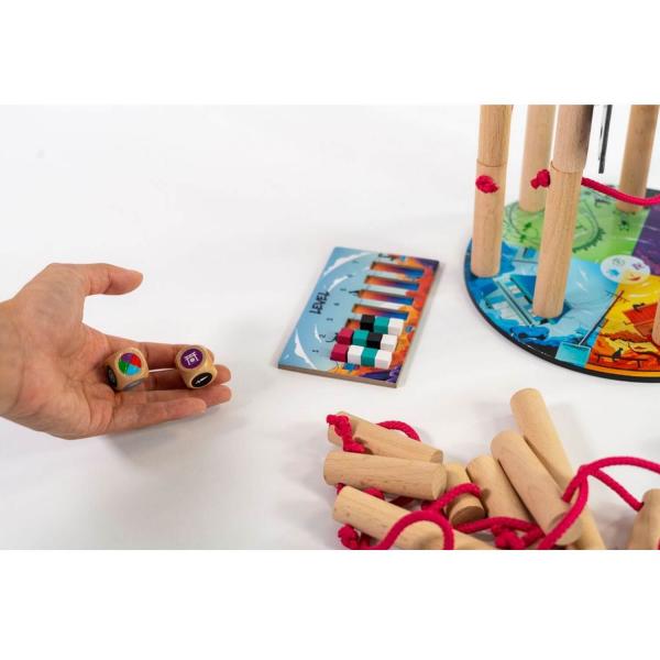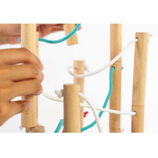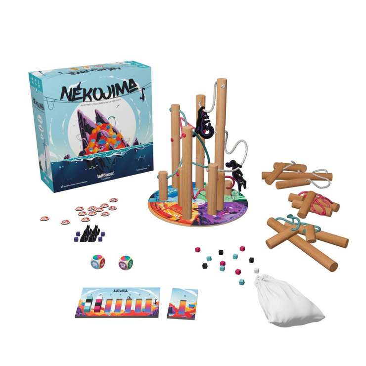 Nekojima is a wooden game of skill and dexterity in which you have to keep an entire installation in balance. Players take turns placing or stacking denchuu — 電柱, or electrical poles — respecting the locations without any hanging cables touching. Be careful not to be the one to bring down the structure. This game requires reflection, concentration and skill.