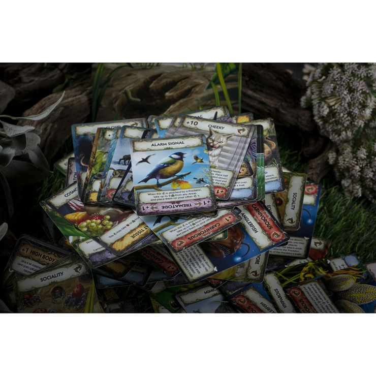 Over the course of six epochs, your successful animals evolve and produce food, while poorly adapted species become extinct or fall prey to predators. The game includes traits based on the anatomy and behavior of real animals inhabiting our planet, accompanied by scientific descriptions and examples of how these traits are used. The game’s cards have colorful illustrations in the spirit of historical zoology artwork.