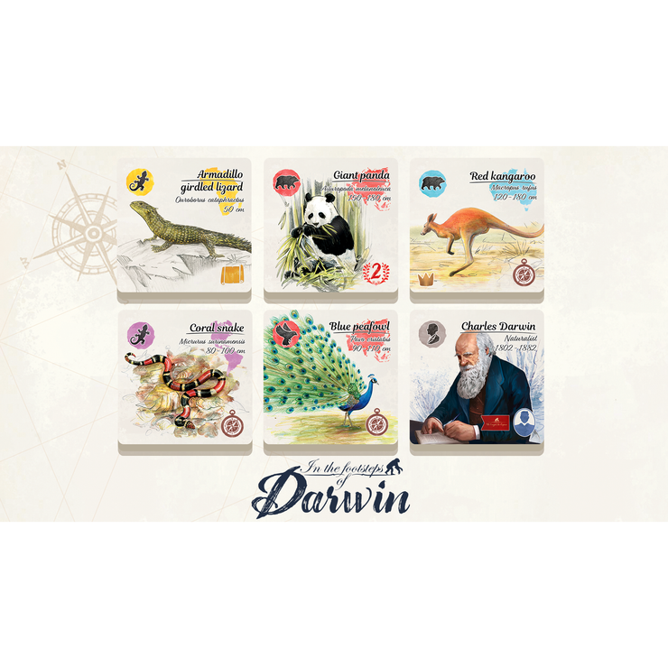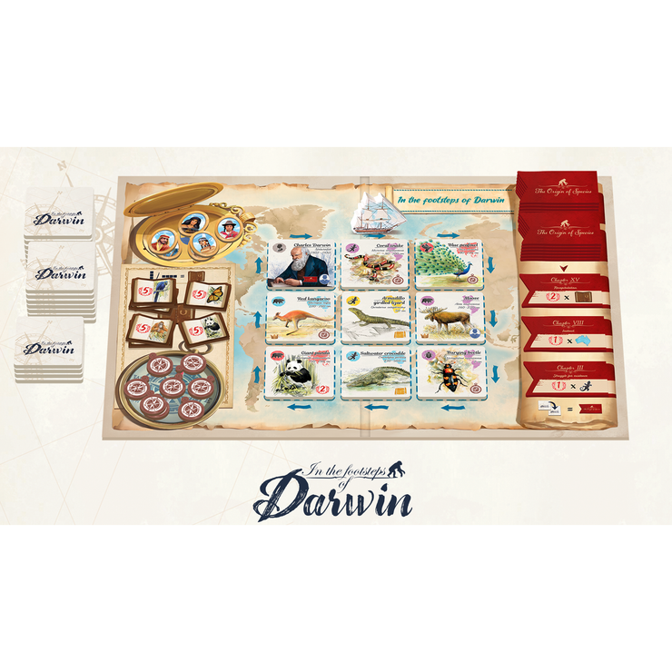In the Footsteps of Darwin is a family game for 2 to 5 players where naturalists complete their notebook by choosing Animal and Characters tiles from a shared Journey board. But be careful, only the tiles in front of the Beagle can be chosen!