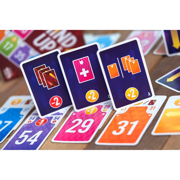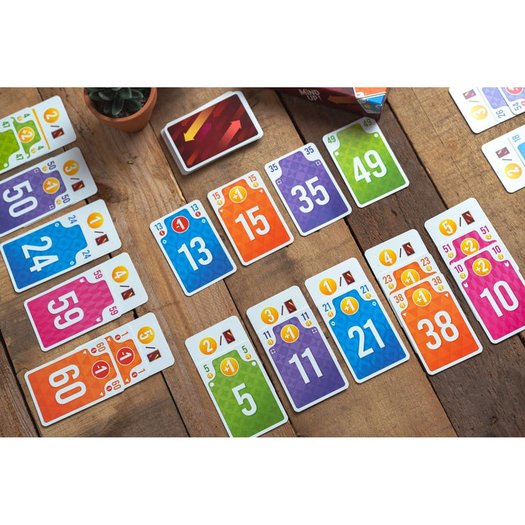 Mind Up! is a clever card game that'll leave you wanting more. You start with a line of cards on the table equal to the number of players. Each player will pick a card from their hand and simultaneously reveal to make a new line right below. Order these cards from lowest to highest value. Players will then take the card directly above the one they just played and add it to their tableau. These cards will score points at the end of the round depending on their color and the order they were picked.
