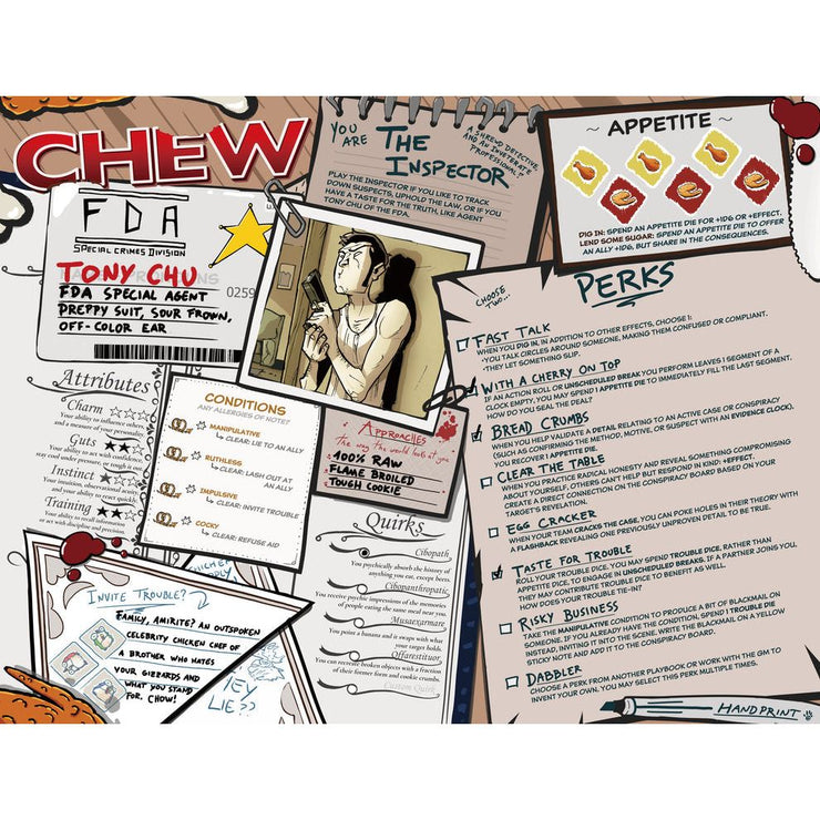 Entertain guests with colorful, over-the-top character sheets! Choose from 8 different playbook sheets with portraits—or even ones with sketches to guide your own napkin doodles! Includes premade characters from the cast of CHEW and handy... ah, handouts.