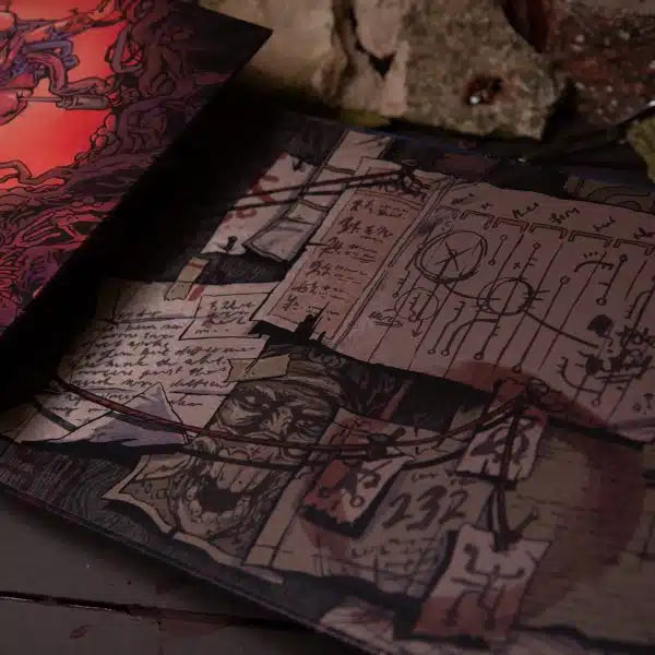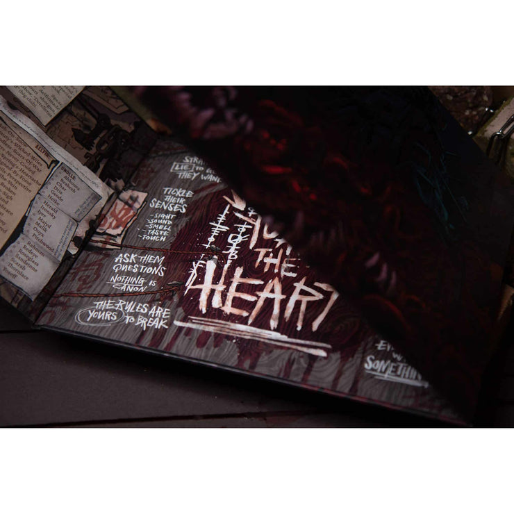 The GM facing side features a lusciously detailed wall of notes, trinkets, and evocative GMing tips scrawled by a Heart-obsessed Junk Mage. This acts as an immersive insight into the world, and the perfect blank canvas for a GM to build upon by using the content found within the 24 page booklet.