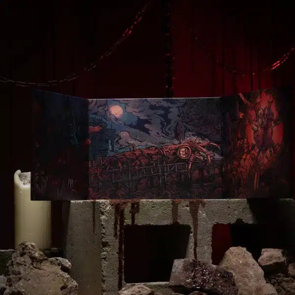 The Heart GM Screen is a gorgeous three-panel landscape screen. The player facing side depicts the sprawling vista of the Below, where the Delving Machine featured in Dagger in the Heart cuts through reality to reach the centre of the Heart.