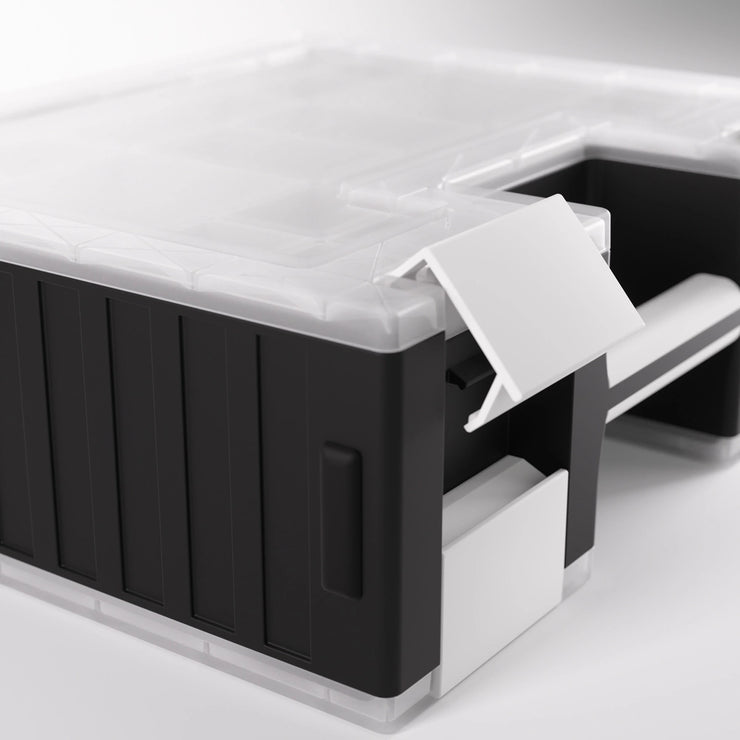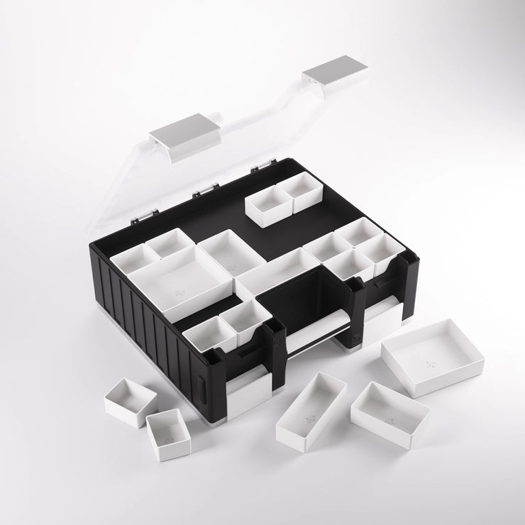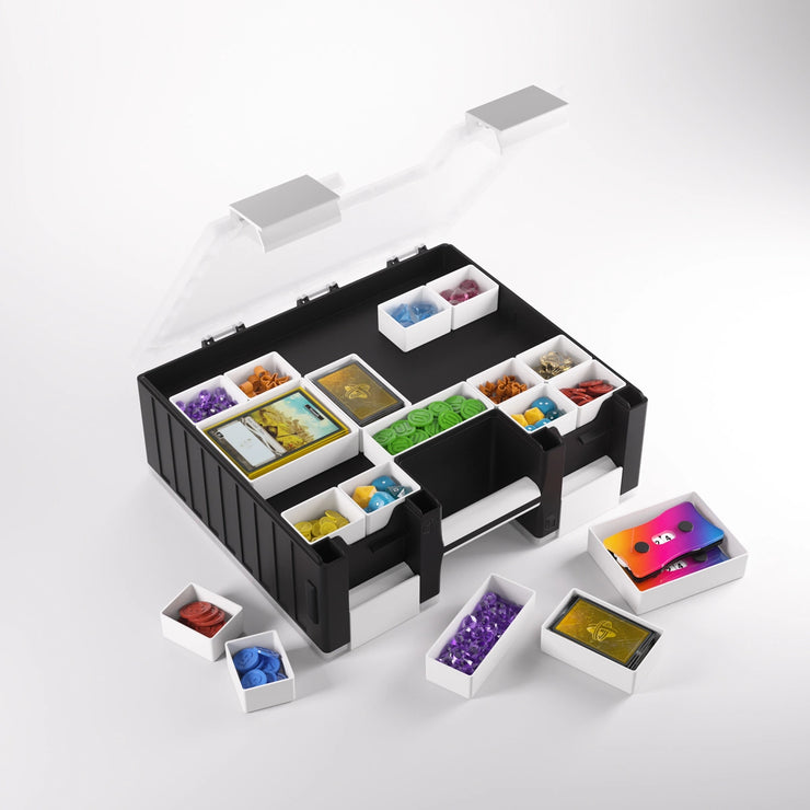 One side of the box houses six removable card holders for 600 double-sleeved cards in Thick Inner Sleeves or 800 board-game-sleeved cards. The other side holds 19 removable trays in 5 different sizes, including an extra-long tray to store movement/range tools, two trays in Mini-American card size, and two in Standard Card Game size. The trays can be swapped with those from the Gamegenic Token Silo and the Token Silo Cards Add-on, offering many different size and color combinations. The innovative clip mechanism ensures precise and secure closure.