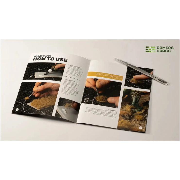 This Starter Box contains 4 full sheets of Grass Tufts, 1 Pair of Tweezers, 1 Bottle of PVA glue and 1 Basing Guide Booklet.