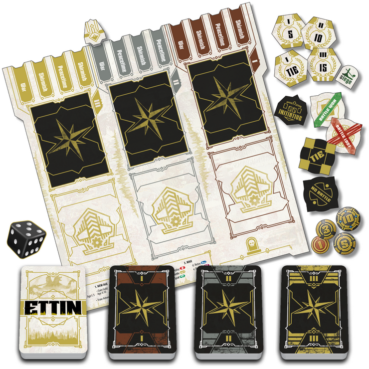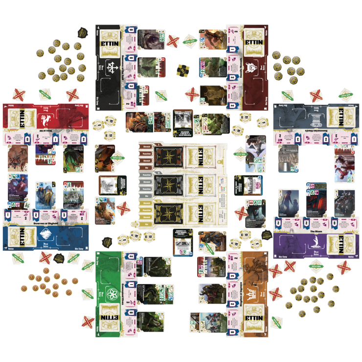 In Ettin, 2-8 players create teams of two Nations (an odd player creates a Rogue Nation) and work to defeat the other teams around the table. Draft units to recruit and deploy in three rounds of increasingly epic Wars. Harness the unique cards and playstyle for each of 8 Nations, and dozens of possible alliances.