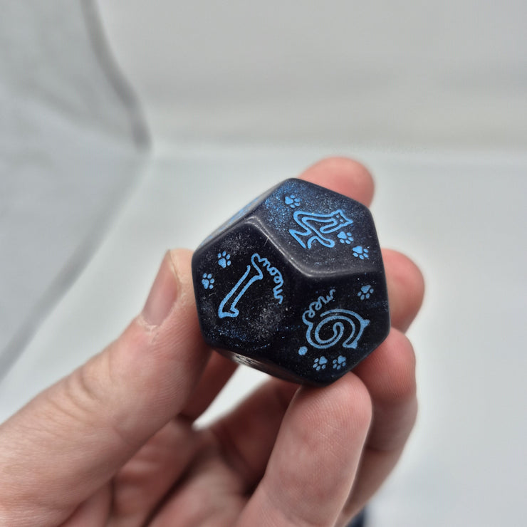 - A glittery navy-light blue cat — The background of the dice is glittery navy, with light blue paintings.