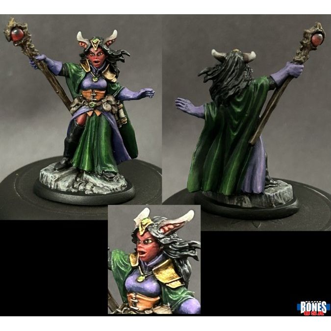 This fantastic miniature is printed in Reaper'shigh-quality RMPrint material. "Valavir Nightsong" is the perfect miniature to represent any half-fiend or wizard character or NPC.