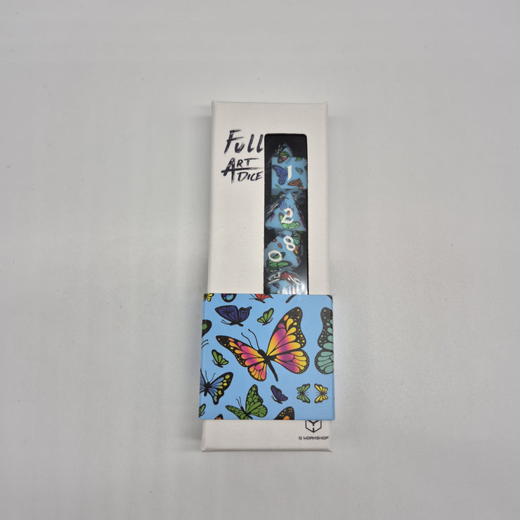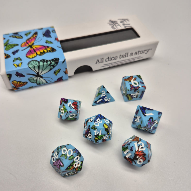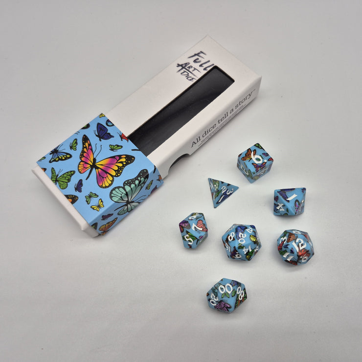 The Full Art Dice™ Set: Butterfly captures the beauty of motion and color. Vivid butterflies glide seamlessly across 7 polyhedral dice, creating a living tapestry of sky and wings. Clear runic digits make every throw easy to read — and hard to forget. These dice let you be a connoisseur of your own making.