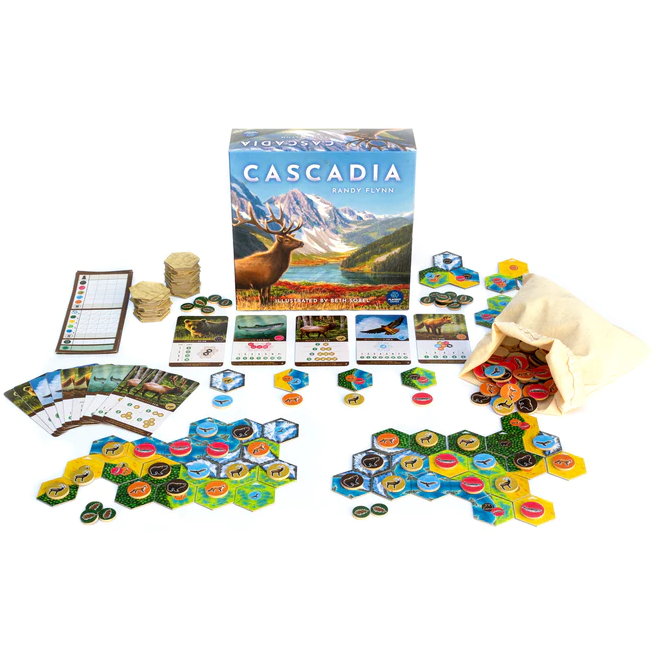 Cascadia is a puzzly tile-laying game featuring the habitats and wildlife of the Pacific Northwest! In Cascadia, players take turns building their terrain and populating it with wildlife. Players must create a diverse and harmonious ecosystem - each animal species has a different spatial preference and each habitat must be placed to reduce fragmentation and create wildlife corridors.