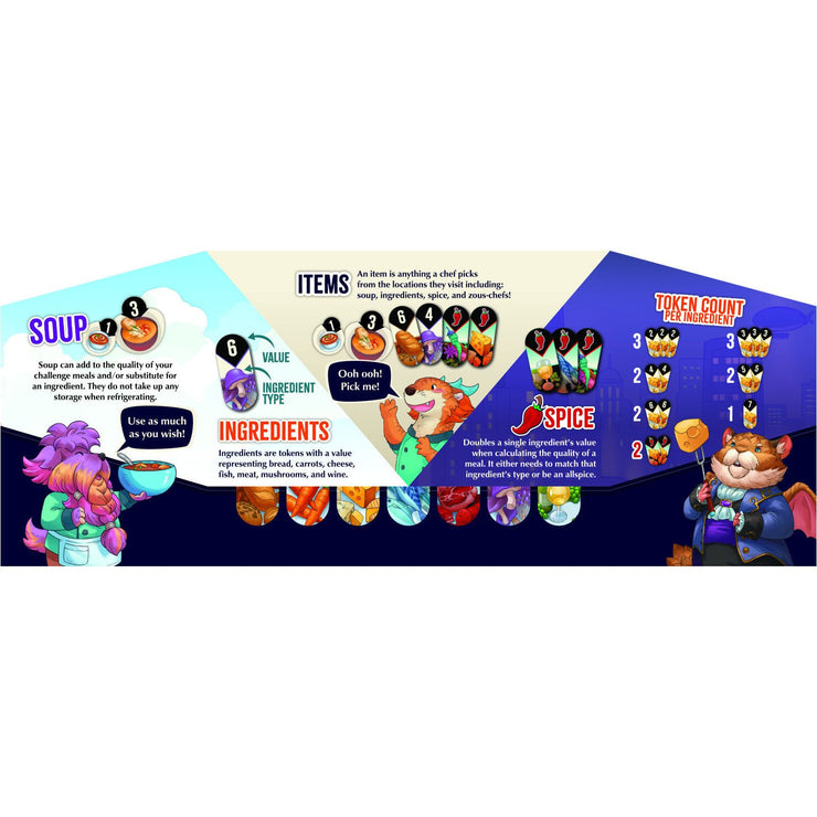 Challenges, revealed in rounds 1 through 6, offer the players opportunities to earn stars for crafting dishes with specific ingredient requirements. After round 7 the players must create an epic meal to impress the celebrity critic and cater to their appetites. A multitude of different critics, rumors and restaurateurs mean every game is fresh!