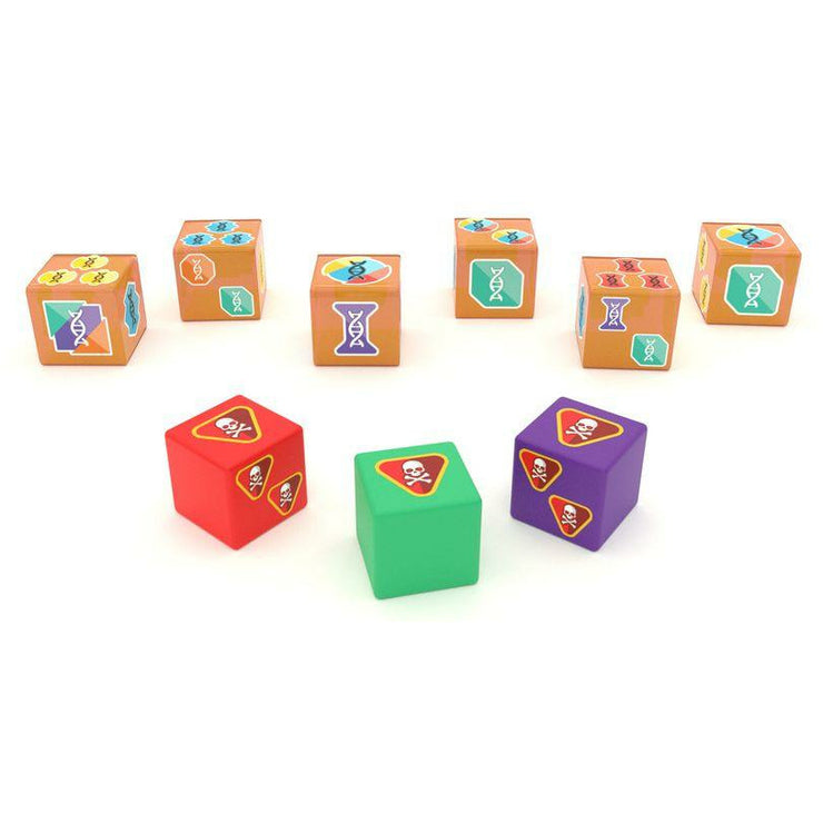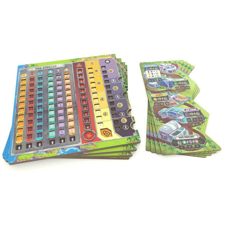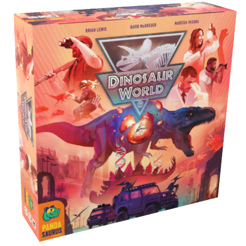 Each round in Dinosaur World, you draft a new résumé card to acquire new workers; spend workers to take public actions building your park and acquiring DNA; spend further workers to take private actions improving that park; then drive your jeep around experiencing the wonder and excitement of what you have built! Throughout the game you acquire victory points through a variety of means — and possibly a few visitor deaths as a natural consequence of overly enthusiastic dinosaur encounters. At the end of the game, you lose points if you accumulated too many deaths, then the player with the most points wins!