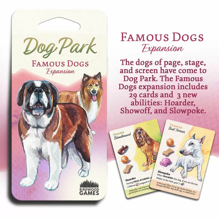 The dogs of page, stage, and screen have come to Dog Park. The Famous Dogs expansion includes 29 dog cards with 3 new abilities: Hoarder, Show Off, and Slowpoke.