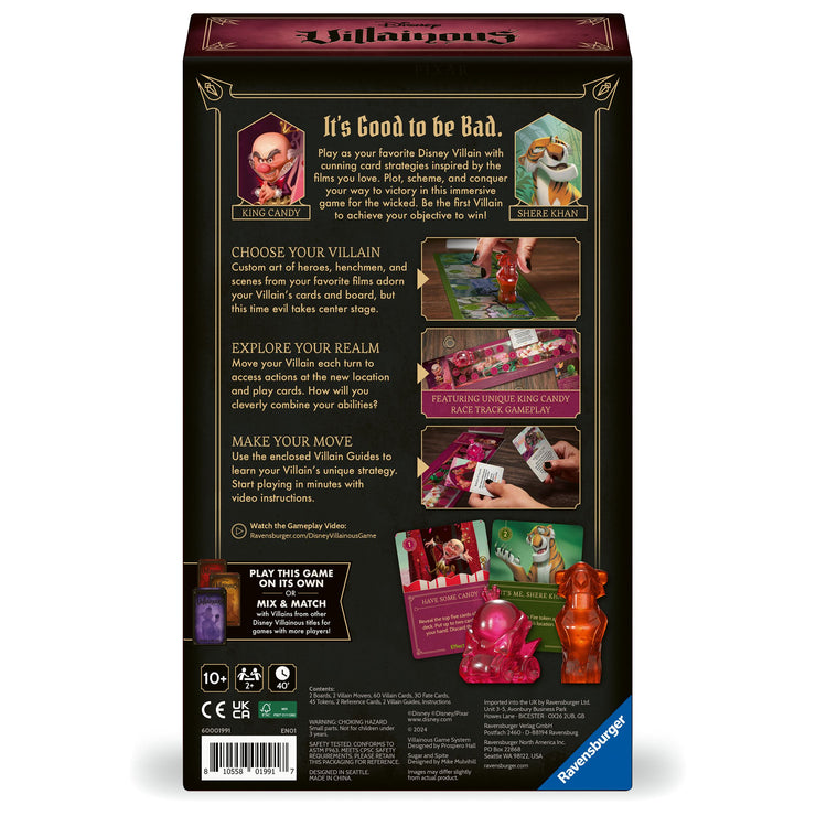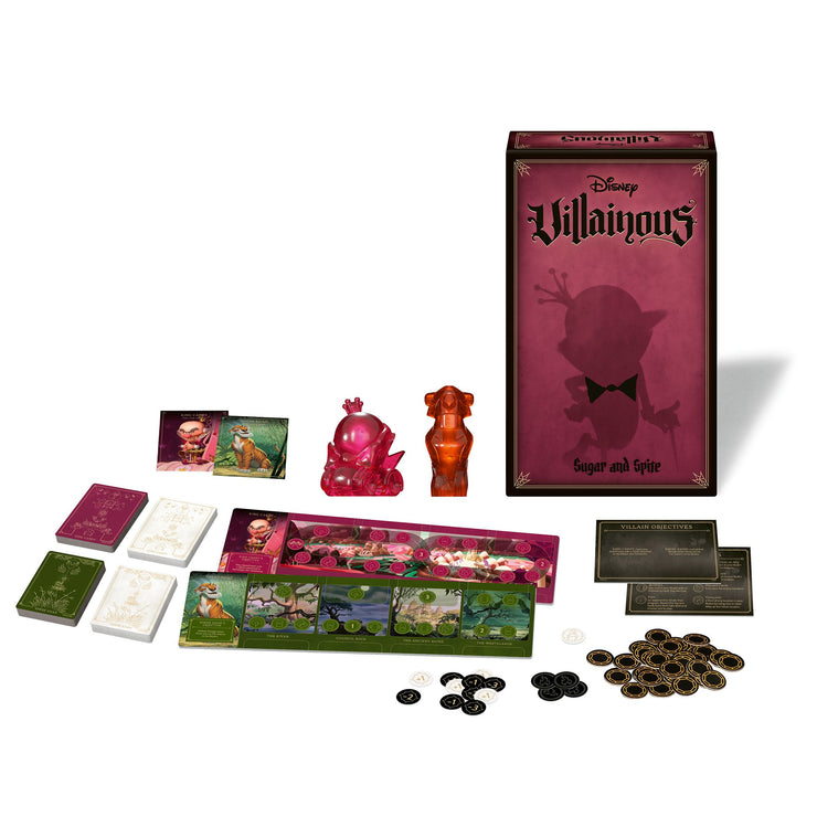 In Villainous: Sugar and Spite, each player takes control of one of two Disney characters, each a villain in a different Disney movie, specifically King Candy (Wreck-It Ralph) and Shere Khan (The Jungle Book). Each player has their own villain deck, fate deck, player board, and 3D character.