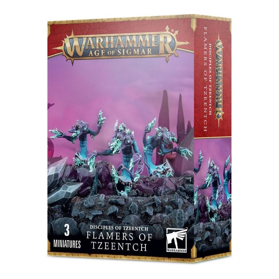 This multi-part plastic kit contains components necessary to build 3 Flamers of Tzeentch, multi-headed spellcasters with warpfire billowing from their terrifying toothed arms. One model can be assembled as a Pyrocaster, seemingly more of fire than flesh.