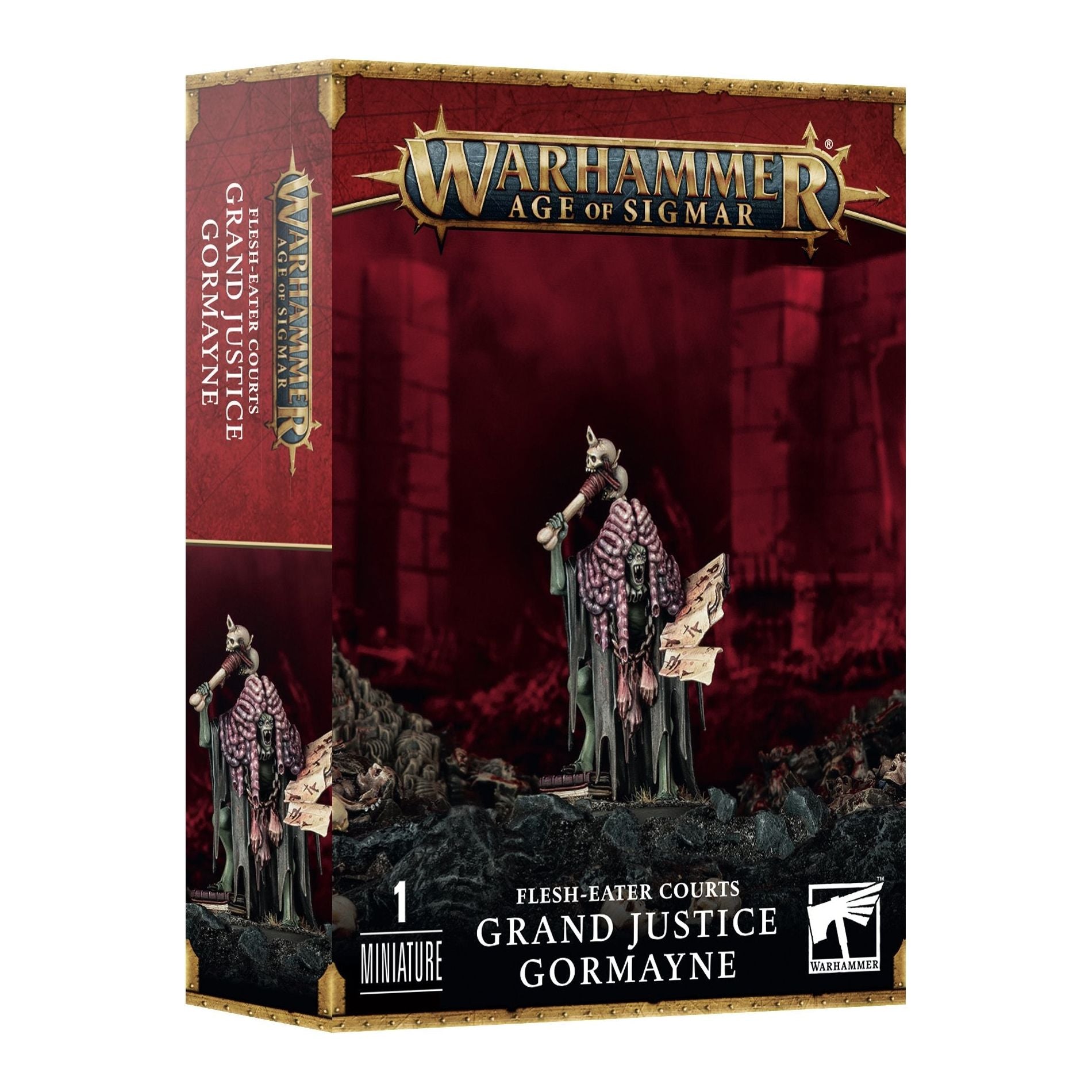 This multipart plastic kit builds Grand Justice Gormayne, a horrifying vampiric arbiter of the Flesh-eater Courts. Swinging a gore-streaked gavel fashioned from well-gnawed bones, the Grand Justice calls for order and cracks unruly skulls. He pronounces judgement on Ushoran's enemies whilst dressed in what he believes to be the finest robes and wig of office, reading ancient laws from a ragged 'legal tome'.