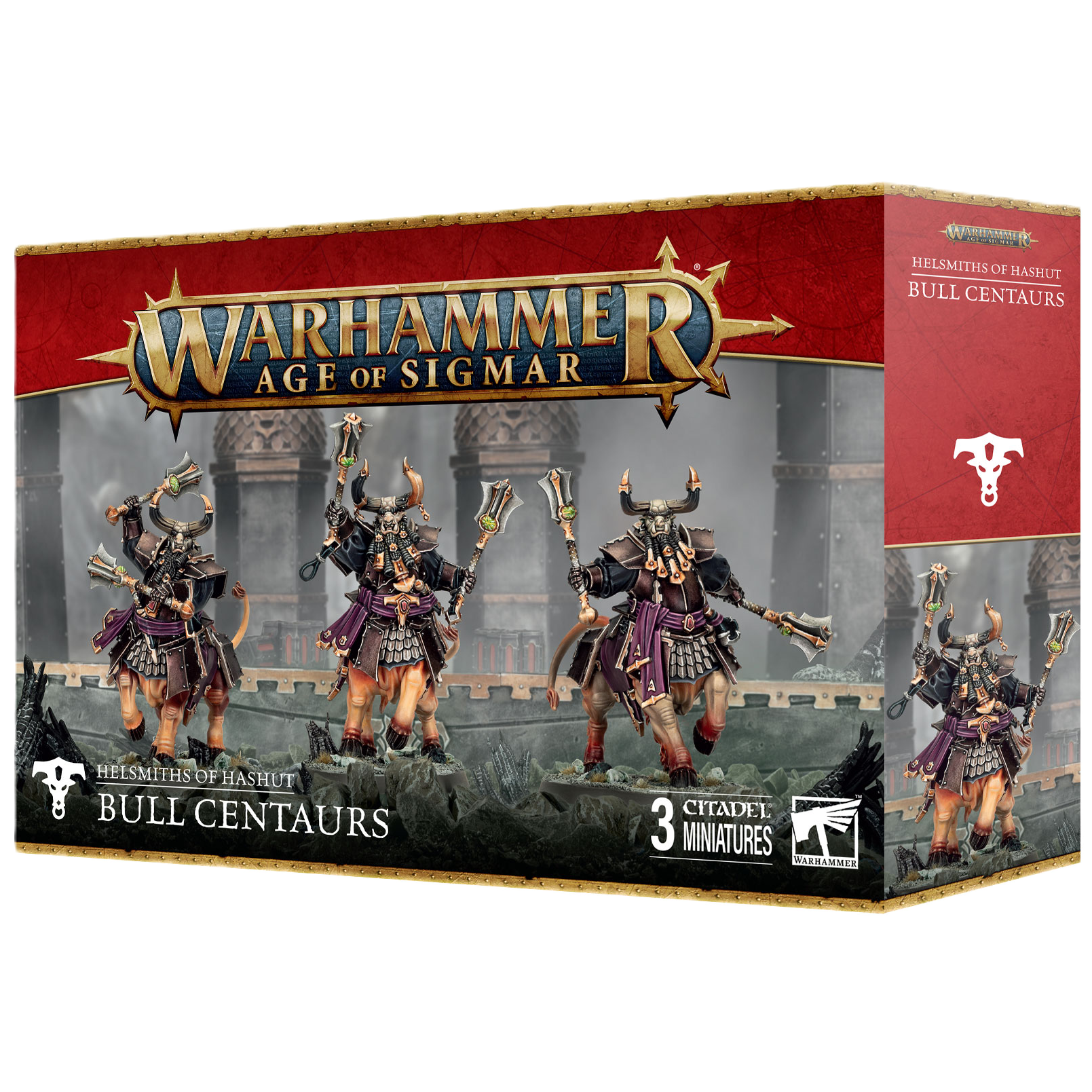 This multipart plastic kit builds three Bull Centaurs, powerful line-breakers for your Helsmiths of Hashut armies in games of Warhammer Age of Sigmar. Powerfully muscled, with hooves and horns, they are especially deadly as they charge into combat, pulping their enemies with blows from their brazen mauls. These imposing miniatures encapsulate everything brutal and intimidating about the Helsmiths of Hashut, making them a key unit in any collection and a great place to showcase your painting skills. The kit includes four sets of interchangeable horns and parts to build an optional unit champion.