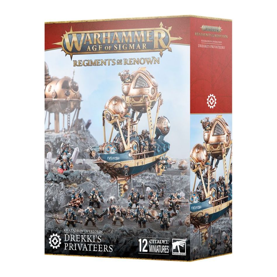 This boxed set builds Drekki's Privateers – a Regiment of Renown for your Cities of Sigmar, Daughters of Khaine, Fyreslayers, Idoneth Deepkin, Lumineth Realm-lords, Ogor Mawtribes, Seraphon, Stormcast Eternals, or Sylvaneth armies in games of Warhammer Age of Sigmar. It's also a great way to start a new Kharadron Overlords collection – or expand an existing army – and save money compared to buying the kits individually. The legendary Drekki Flynt is ready for swashbuckling action, and his crew are happy to follow him into battle, knowing that treasure will follow in his wake. Their Arkanaut Frigate ensures they can get exactly where they need to be – or make a hasty exit!