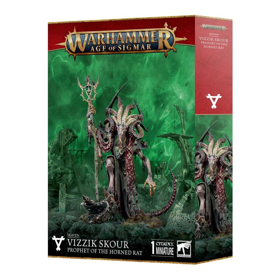 This multipart plastic kit builds Vizzik Skour, a daemonic priest of the ascended Horned Rat, and an incredibly powerful leader for your Skaven armies. This immense model looms over the battlefield, and is festooned with details that make it a fantastic centrepiece for your entire collection.