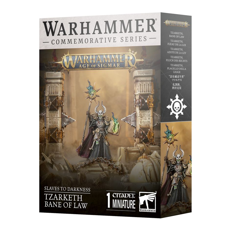 Celebrate Warhammer Day 2024 with the sinister Tzarketh, Bane of Law. This Commemorative Series miniature can also be used to represent a Chaos Sorcerer Lord for use in Slaves to Darkness armies in games of Warhammer Age of Sigmar.