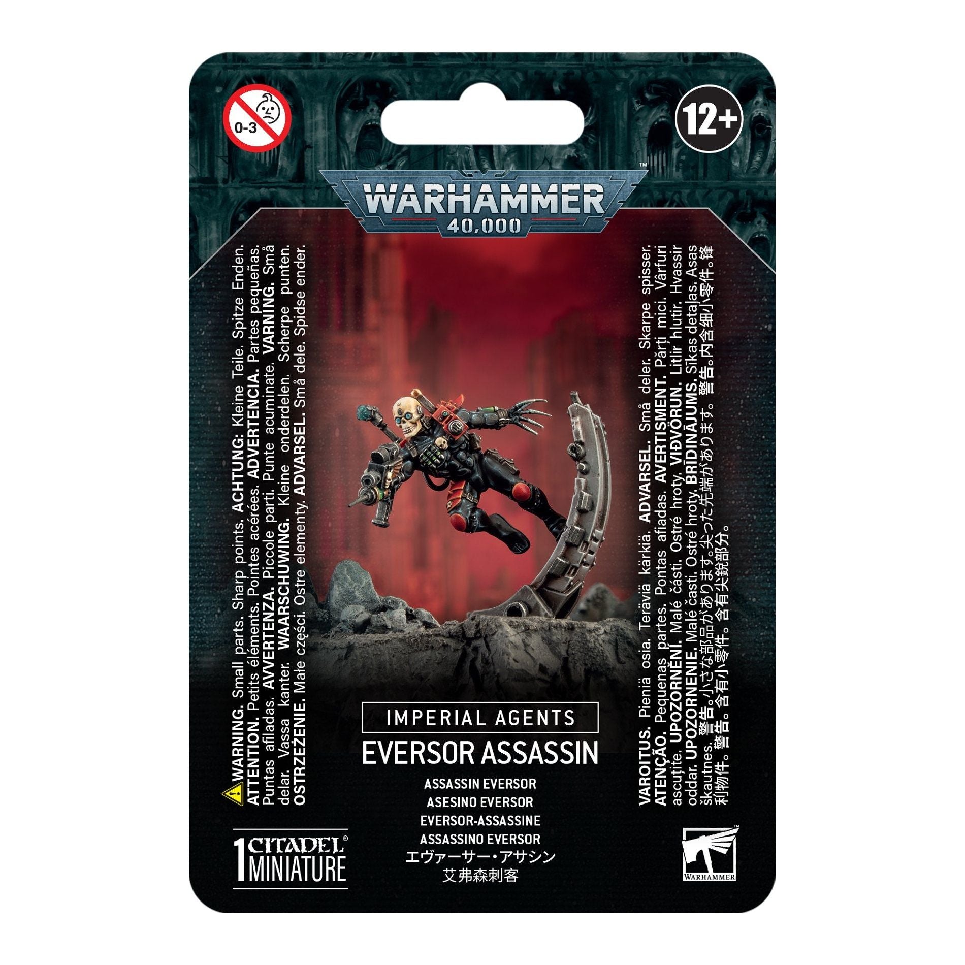 This multipart plastic kit builds an Eversor Assassin, a rampaging Imperial Agent deployed to tear apart enemies of the Imperium. Clad in a reinforced bodyglove and morbid skull mask, the Eversor is an unstoppable killer armed with a clawed neuro gauntlet and vicious needle pistol, as well as a power blade strapped to the sentinel array on their back. They are perfect for eliminating targets in a blaze of psychotic fury, disregarding factors such as collateral damage, practicality, or the potential innocence of bystanders.