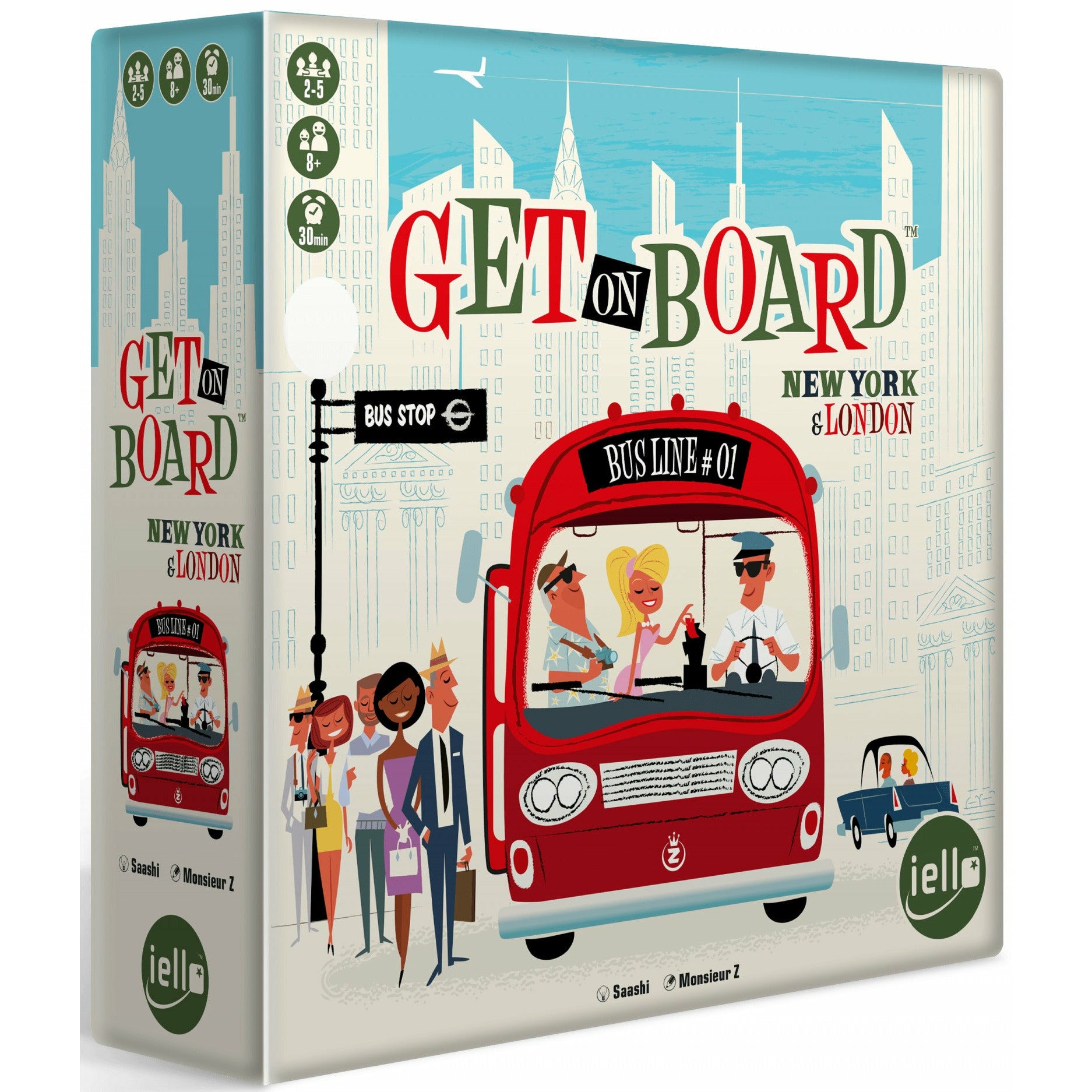 In Get on Board: New York & London, you have twelve rounds in which to build the best bus line in town. Each round reveals a new card that shows each player the route shape they must complete. Place your bus accordingly on the central board. Take the passengers where they want to go by connecting them and their destination to your bus line, avoid traffic, and gain as many victory points as possible!