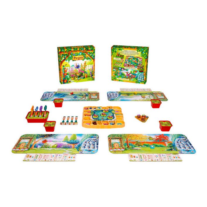 In Pergola, players develop their gardens, grow new plants, and attract insects and small animals. On their turn, a player chooses one of the four available tools, picks the presented items, and arranges them in their garden. Then they perform the action corresponding to the chosen tool. Since players have a lot of freedom in arranging plants in their gardens, after fifteen rounds each garden looks completely different and scores differently. The player who accumulates the most points wins.